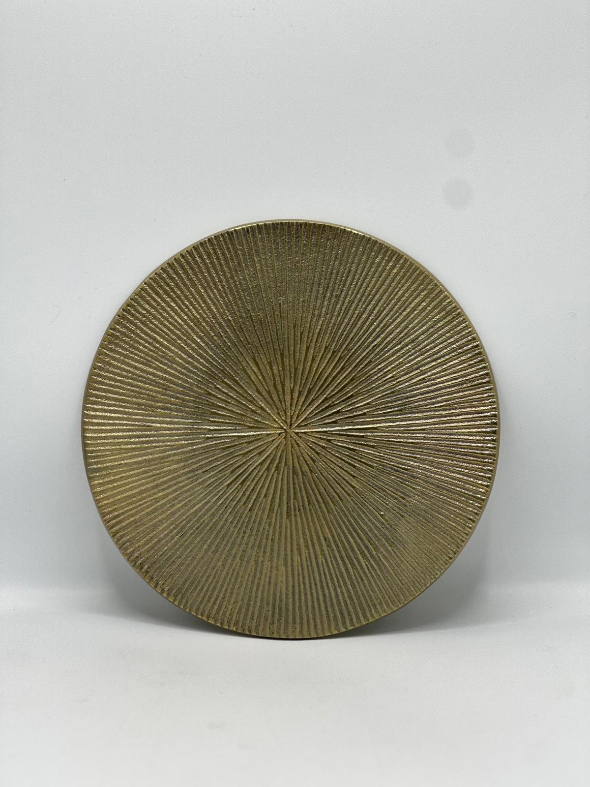 Laat je interieur stralen met dit unieke decoratieve bord van 26cm in een warme goudtint. De fijne reliëflijnen die vanuit het midden uitstralen geven een speels zonnestraaleffect en maken elk exemplaar net een tikkeltje anders. Perfect als chique onderzetter voor kaarsen of accessoires