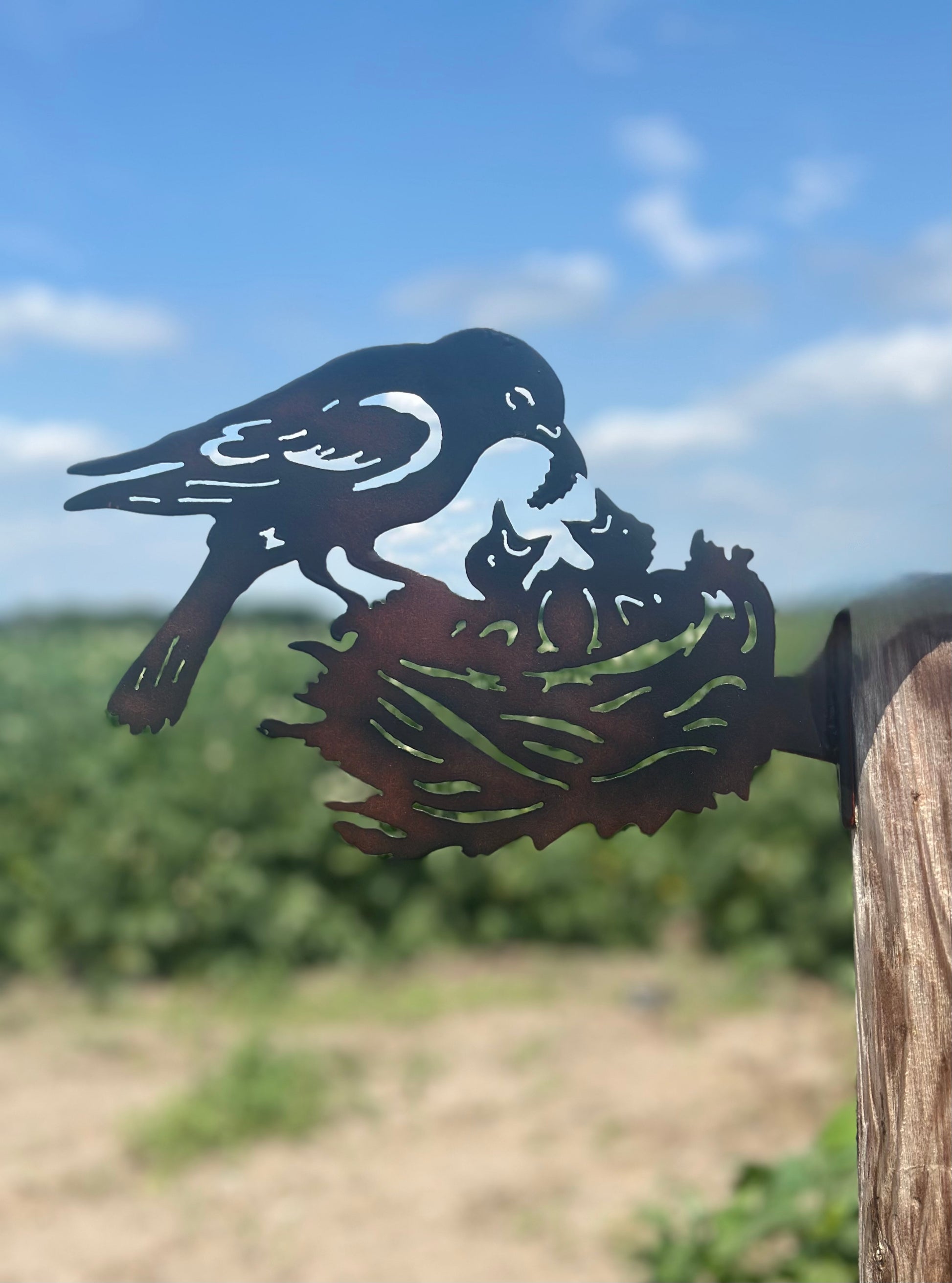 Dit leuke vogeltje voerend op nestje uit staal is een echte eyecatcher voor in je tuin.